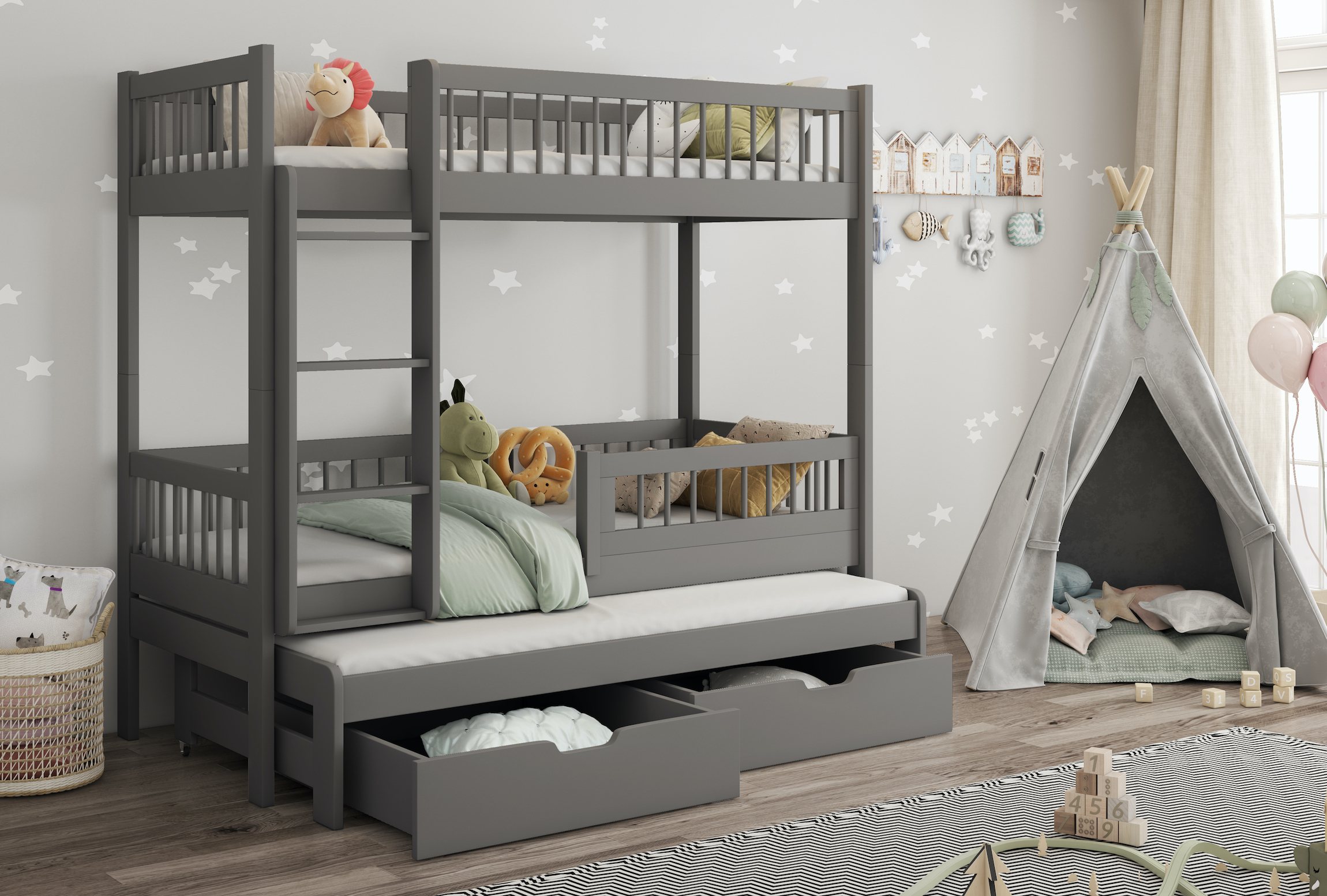 EVAN piękne 3 osobowe łóżko w kolorze grafit akryl (zdjęcie główne) z ciekawym kształtem zagłówków oraz podwójną barierką. Zostało pomalowanie trzykrotnie odpornym na zabrudzenia lakierem. Materace nie występują w komplecie z łóżkiem, należy domówić je oddzielnie. Dostępna kolorystyka poniżej.
