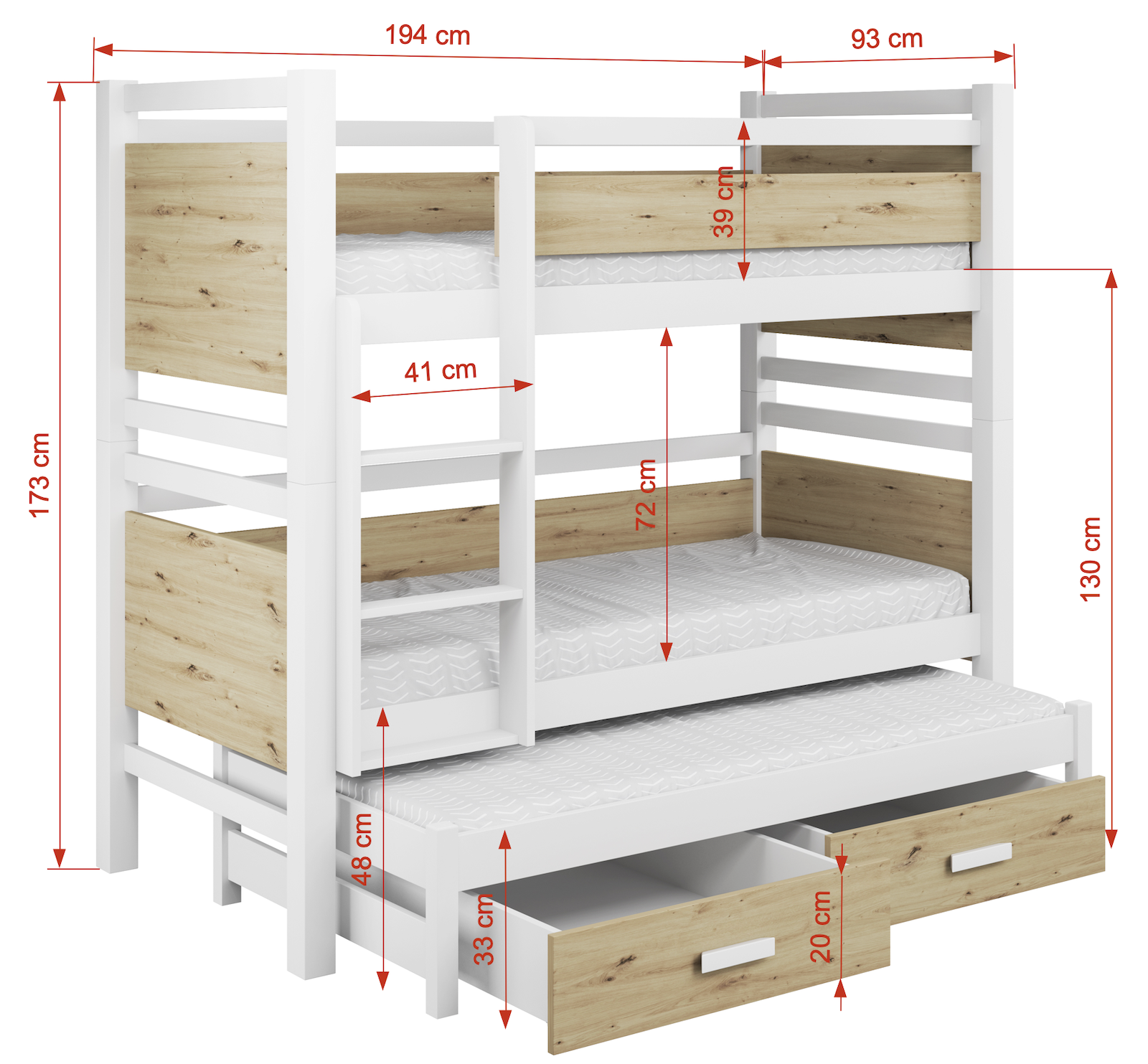 | Prześwit pomiędzy piętrami łóżka | 72 cm |