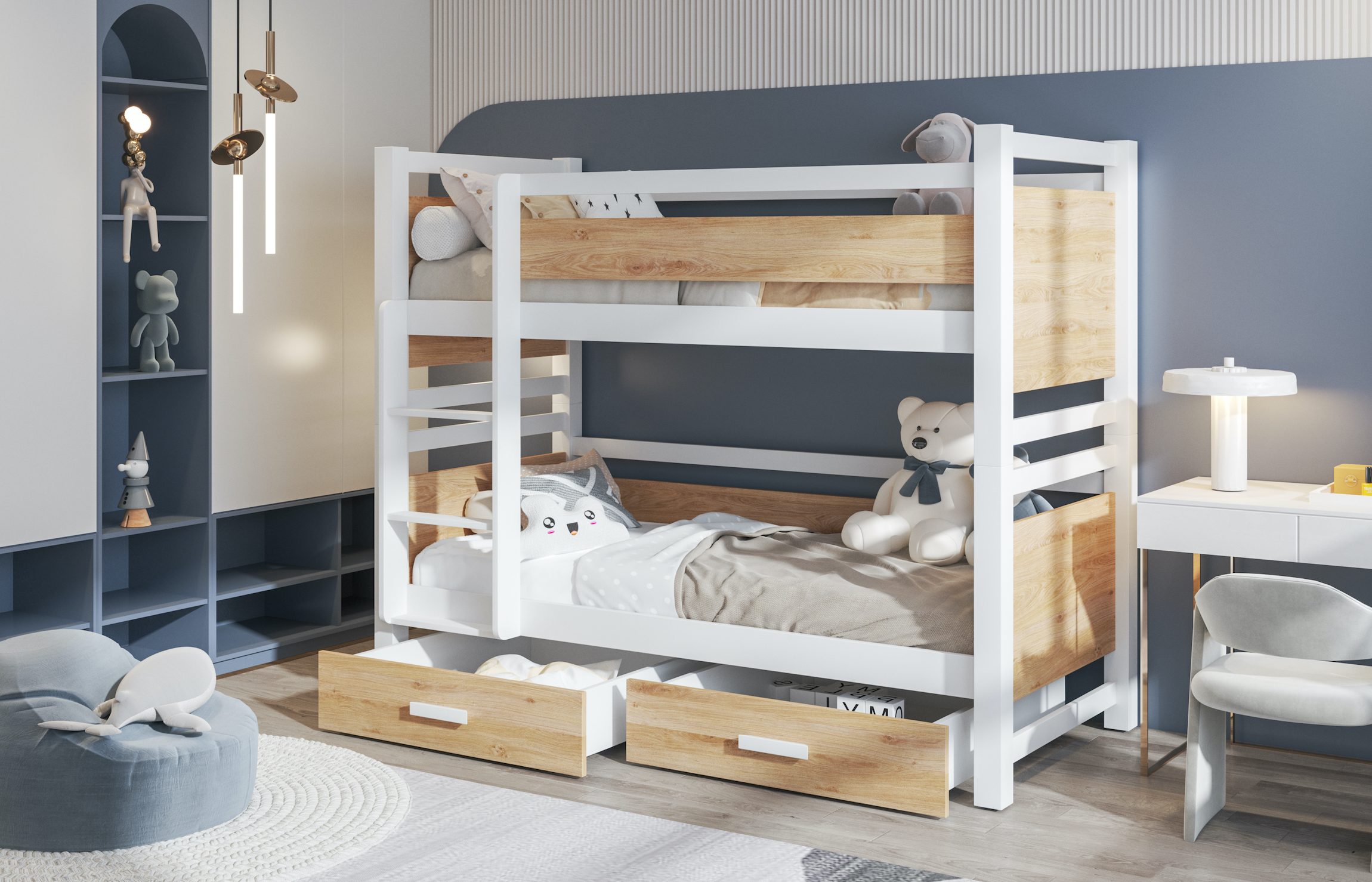 W modelu JANIS rama łóżka została wykonana z drewna sosnowego w kolorze biały akryl, elementy z płyty w kolorze dąb artisan (dostępne również w innych kolorach) zostały oklejone obrzeżem ABS. Dostępna kolorystyka poniżej. Materace nie występują w komplecie z łóżkiem, należy domówić je oddzielnie.